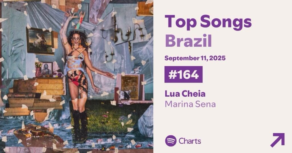 Além disso, Marina conquistou espaço entre os álbuns mais ouvidos no Apple Music, ocupando a 4ª posição com Coisas Naturais. Lua Cheia também aparece entre as 25 músicas mais escutadas, dividindo espaço com artistas como Lady Gaga, Justin Bieber e Billie Eilish.