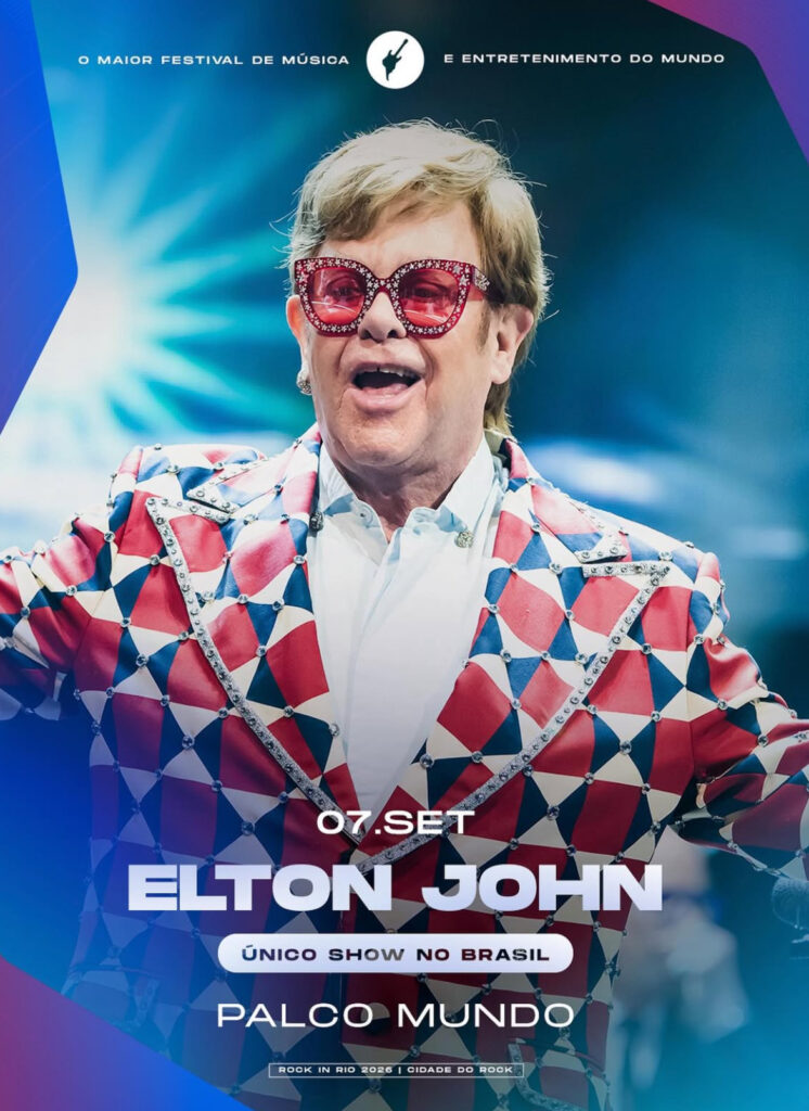 O Rock in Rio 2026 confirmou Sir Elton John como primeira atração principal do Palco Mundo. O artista, um dos mais consagrados da história e detentor do título EGOT, retorna ao Brasil após quase dez anos para um show exclusivo no dia 7 de setembro, marcando sua maior apresentação desde o fim da turnê Farewell Yellow Brick Road. “Eu sempre tive momentos fantásticos no Brasil […] mal posso esperar para voltar”, afirmou o músico.